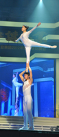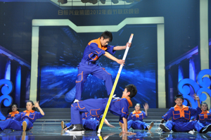 STAR》,引起全場雷動歡呼;同德礦業(yè)公司選送的雜技《肩上芭蕾》驚險刺激,來自北京雜技團的年輕演員們在同伴肩膀上邁起輕盈的舞步,場下觀眾驚呼不已,拍手叫絕;臨汾志強鋼鐵公司的漢子們表演的威風鑼鼓《堯天舜日》高亢激昂,令觀眾們心潮澎湃,更激發(fā)了大家開創(chuàng)美好未來的激情和斗志。